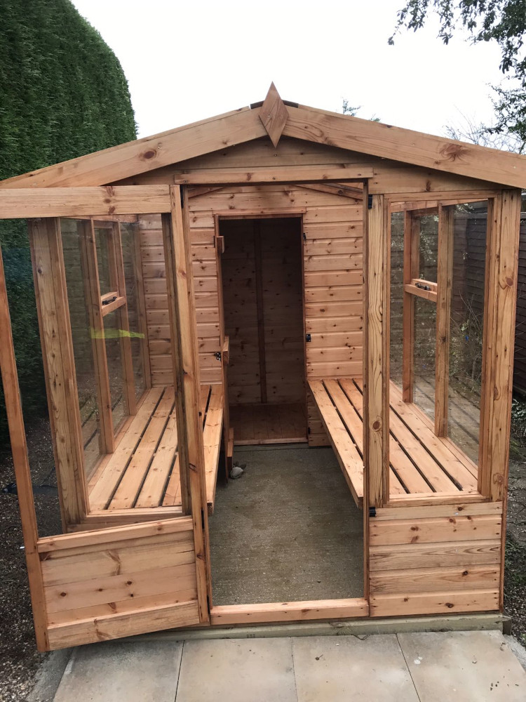 The shed section comes with one opening window whilst the greenhouse section is fully toughened glass from the roof down to the top of the benches, with an opening sash in each side panel.